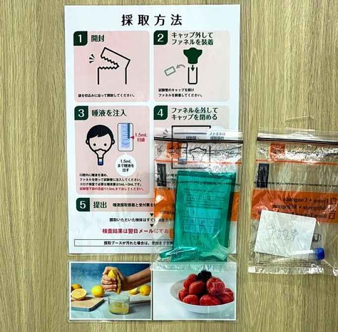 Segundo vídeo da reportagem do NHK, de forma individual e isolada, as pessoas usam um kit descartável para cuspir sua saliva em um coletor.
